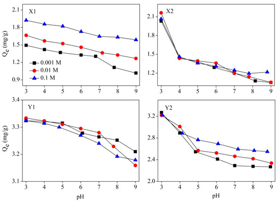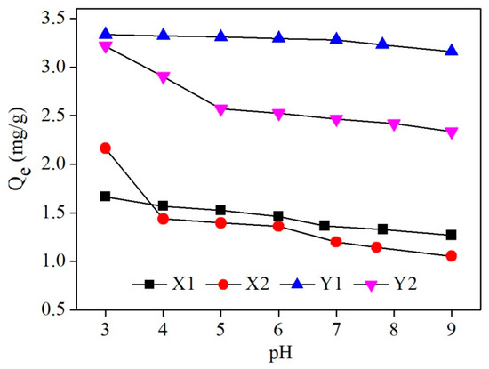 Two-staged Sb adsorption at pH 3.0 is observed in Figure 3. In the rapid first stage, X1, X2, Y1, and Y2 achieve respective Sb adsorption capacities of 91.6%, 85.1%, 91.3%, and 97.1% within 1 h. In the slow second stage, it takes at least 8 h for all the adsorptions to reach a removal ratio of 98%. Thereafter, adsorption hardly increases, and reaction equilibrium is achieved after 24 h. Antimony adsorption abilities under a low Sb condition (2 mg/L) are Y1 ≈ Y2 > X2 > X1. This two-staged reaction characteristic is an important time-setting guidance for subsequent adsorption experiments.
