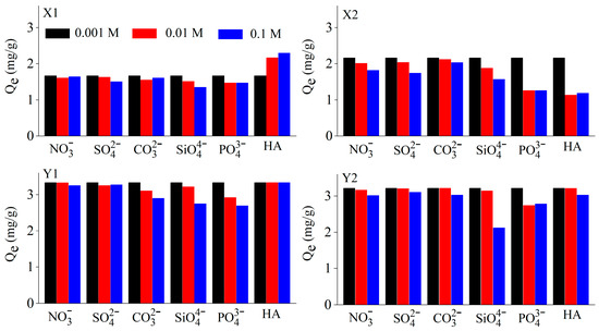 Anions such as Cl−, NO3−, SO42−, CO32−, SiO44−, PO43−, and organic ligands are popular in Sb-contaminated waters. They can play competitive roles with Sb [40], thus decreasing the adsorption efficiency of adsorbents. Results in Figure 7 show a general tendency for the coexisting inorganic anions to exert a negative but limited effect on the adsorption of Sb. Specifically, NO3− and SO42− have a lower effect on Sb adsorption than that of CO32−, SiO44−, and PO43−, in agreement with other studies [27,40]. This phenomenon could be explained by the difference in adsorption mechanisms, where NO3− and SO42− are adsorbed by Fe oxides mainly through outer-sphere complexation [56,57], while CO32−, SiO42−, and PO43− are adsorbed by Fe oxides mainly through inner-sphere complexation [56,58,59]. As for limonites, Sb adsorption by X1 is less affected by coexisting anions than the other three limonites. The effect of HA on Sb adsorption is complex. Antimony adsorption is increased, decreased, and unaffected by HA in X1, X2, Y2, and Y1 experiments. The inhibitions of Sb uptake by HA in X2 and Y2 experiments probably indicate that HA plays a competitive relationship with Sb(V), which is oxidized from Sb(III) by Mn minerals. This part of the experiments indicates that although ionic strength and coexisting anions are effective in Sb adsorption by limonites, they are not the dominant constraints to Sb removal. The effect of anions such as SiO42− and PO43− on Sb removal could be partly offset by adding Ca2+ salts.