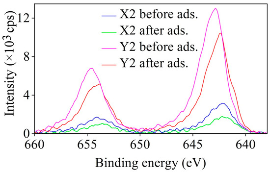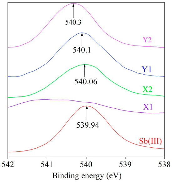 It is observed in Figure 8 that limonites X2, Y1, and Y2 after adsorption show obvious 3d3/2 XPS spectra of Sb [60], indicating efficient Sb adsorption. Shifts in binding energy (BE) to higher values are also observed after adsorption. For electrons of a specific element, their BEs are usually positively correlated to elemental valence. This rule is also applicable for Sb [60], where the BEs of Sb(III) 3d3/2 and Sb(V) 3d3/2 are usually 538.8~539.6 and 539.8~541.7 eV, respectively [61]. Thus, such shifts possibly indicate partial or total oxidation of Sb(III) to Sb(V) by minerals in limonites. The shift extents of BE are Y2 > Y1 > X2, which may indicate that Mn content controls the oxidation of Sb. For Mn-free Y1, the XPS result-implicated oxidation of Sb(III) to Sb(V) could be due to Fe oxides [39,40,53]. The 2p XPS peaks of Mn are shown in Figure 9. It is observed that the peak intensity of Y2 is much higher than that of X2, consisting of the difference in Mn content (Table 1). For peak position, decreases in BE both for 2p1/2 and 2p3/2 peaks are observed after adsorption, indicating the reduction in Mn [62]. Specifically, for X2, such a decrease is obvious only to peak 2p1/2, which may indicate that Mn reduction in X2 is weaker than that in Y2.