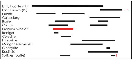 - Finch, R.; Murakami, T. Systematic and paragenesis of uranium minerals. In Uranium: Mineralogy, Geochemistry and the Environment, Reviews in Mineralogy; Burns, P.C., Finch, R., Eds.; Walter de Gruyter GmbH & Co. KG.: Berlin, Germany, 1999; Volume 38, pp. 9–179. [Google Scholar]
