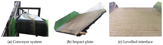 To perform a single test, 20 of sand was evenly loaded onto the feeding conveyor, as shown in Figure 4a. The loading zone started behind the centre of the head pulley and stretched over a length of . This ensured that the material travelled at the same speed as the belt before reaching the point of discharge. The width of the loading zone was approximately 300 . The conveyor was mounted on four HBM U2A 10 load cells, sampled at 200 , from which the mass flow rate could be calculated. The conveyor speed was always set to .
