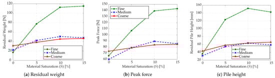 Figure 6a shows how the residual weight, in a dry state (), increased as the particle size increased from fine to coarse. This corresponded with the same trend observed in the calibrated coefficient of friction, which was , and , respectively. Contrastingly, this trend was reversed when the wet materials were examined. The fine sand also showed the largest increase in residual weight with increased moisture, whilst the medium sand’s residual weight roughly doubled and the coarse sand’s slightly increased. A similar response is observed in Figure 6b for the peak force. As expected, the trend in pile height, shown in Figure 6c, closely followed that of the residual weight.