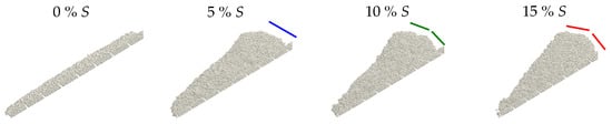 There are various techniques available to measure moisture content, and here, the level of saturation S was used. In the dry state, the saturation is , and when , all pores are fully filled with water. Three levels of cohesion were induced by adding moisture (water) to the sand such that , and , respectively. This is the same sand as was used in two related studies; for more details, see [44,45].