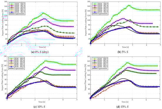 The impact force–time response was compared for the three sand grades, of which an example is shown in Figure 9 for the medium sand and six clump scale factors at four saturation levels. The total loading force resulted from a combination of net material build-up on the plate and the dynamic impact force due to the discharging stream. Thus, the peak loading force was reached just before the discharge stopped (after approximately to ). Hereafter, the net material build-up decreased as some material continued to drain from the plate. After material drainage stopped, a residual amount of material was retained on the plate (the residual weight).