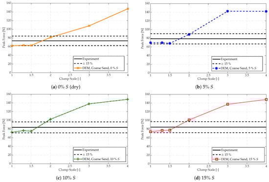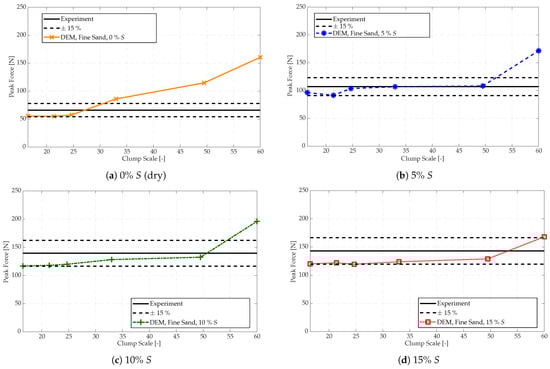 Similar trends were observed for the medium sand; however, clump scaling factors up to M3.7 were accurate, i.e., a mean particle diameter (Table 1). The peak forces of the fine sand are shown in Figure 11. In the dry case (Figure 11a), accurate predictions were made for clump scales up to a factor of F24.7, i.e., a mean particle diameter (Table 1). However, in the wet cases (Figure 11b–d), the predictions were accurate up to a scale factor of F49.5, i.e., a mean particle diameter (Table 1).