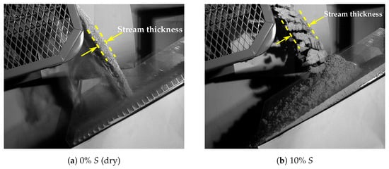This is further supported by the results of the fine sand where, in the dry state, the thickness of the discharge stream was also approximately 30 , but in the wet states, it was approximately 60 (Figure 12). In the dry state, the maximum scale factor was F24.7 (Figure 11a), which equates to a mean particle diameter of , and again a stream thickness resolution of particle diameters. In the wet states, the maximum scale factor was F49.5 (Figure 11b–d), which equates to a mean particle diameter of , and again a stream thickness resolution of particle diameters.