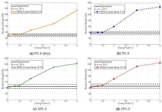 DEM prediction of the residual weight of the coarse sand as a function of the clump scale and four saturation levels. The experimental mean () is indicated for each saturation level.