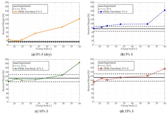 DEM prediction of the residual weight of the fine sand as a function of the clump scale and four saturation levels. The experimental mean () is indicated for each saturation level.