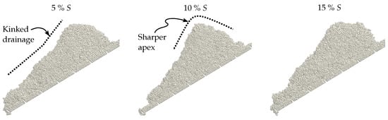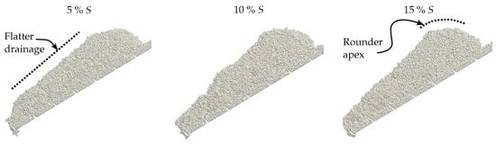 All the other input parameters were kept constant, and the resulting piles are shown in Figure 17. Comparing this to Figure 7 and Figure 15 shows the improvement in modelling the profile of the build-up. Using the newly generated PSD, the triangular shape of the pile improved, and a sharper peak (apex) was predicted, which compared better to the experiment than the results from using the original PSD. Moreover, the material drainage towards the toe of the pile appeared less flat, and a kink manifested in the drainage profiles, which was similar to that in the experiment and visible in Figure 7. Consequently, it shows that using a more precise PSD with more accurate relative ratios between particle sizes was vital for accurate simulations, even if the whole PSD was significantly scaled relative to the physical material.