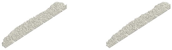 The model of the geometry of the conveyor, including the belt and transition zone, the head pulley and the impact plate, was an accurate representation of the experiment. It was assumed that the flexibility of the belt was negligible, and therefore, it was modelled as rigid. For a discussion on applications where it is important to include the flexibility of the belt, see [43]. The feeding conveyor was loaded with material in identically the same way as in the experiment (Figure 3b and Figure 4b), and with the particle density accurately calibrated, it could be assumed that the initial bulk density of the material in the model was the same as in the experiment.