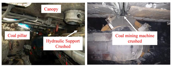 Coal has been one of the most important sources of primary energy, together with oil and natural gas, for many decades now. Approximately one-third of the world’s energy and 40% of electricity is generated from coal, which will remain an important part of the global energy mix in the medium to long term [1,2]. During the early extraction of coal resources, the room-and-pillar mining method has become one of the most common coal mining methods due to its simple excavation equipment and mining process. However, the residual coal pillars, under the comprehensive influence of long-term overlying strata pressure, mine water erosion, and the disturbance of adjacent coal seam excavation, may be damaged and result in ground collapse, building damage, and underground rock burst and support crushed accidents [3,4], which have become a severe challenge for environmental protection and safe mining. In China, the northwest mining area is one of the highest coal-producing areas, and the room-and-pillar mining method was widely adopted in the early years, which resulted in numerous residual coal pillars in the goaf. Ground collapse and support crushed accidents in longwall mining of adjacent working faces are caused by the instability of the residual coal pillars, as shown in Figure 1 and Figure 2. In fact, it is not just in China, as one study also showed that over the past decade, rib falls have resulted in 12 fatalities, representing 28% of ground fall fatalities in the United States’ underground coal mines. Nine of these twelve fatalities (75%) occurred in room-and-pillar mines [5], causing serious casualties and economic losses [6]. Therefore, an accurate assessment of coal pillar instability and its failure characteristics and an exploration of scientific mining methods that can be employed to prevent coal pillar failure are crucial for the safe mining of adjacent coal seams.