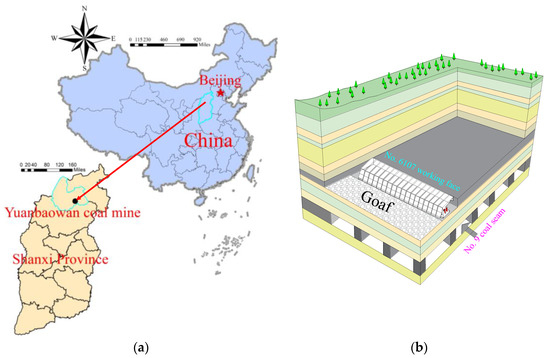 Yuanbaowan coal mine is located in Shuozhou City (Shanxi Province) in the territory of Shanyin County (Figure 3a). At present, the No. 6 coal seam has an average depth of 150 m and is mainly mined in the Yuanbaowan coal mine; it is located above the No. 9 coal seam, and the average thickness of the rock strata between the seams is approximately 15 m. The advancing direction of the No. 6107 working face has a cumulative length of 240 m and is located directly above the room-and-pillar type of goaf of the No. 9 seam, and its working face faces the stirrups in this area. The length and width of the goaf in the No. 9 coal seam are approximately 25–50 m and 5–15 m, respectively, and the height of the residual coal pillar is 5–9 m (average 8 m). The relative position of the No. 6107 working face and its underlying room-and-pillar mining goaf are shown in Figure 3b. The inclination angle of the No. 6 coal seam is 4–8° (average 6°), and the room-and-pillar mining goaf of the No. 9 coal seam below the No. 6107 working face has a slightly lower coal seam inclination angle (average of approximately 3°).