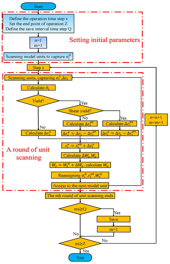 When the total energy, elastic strain, and dissipation energies located in each subregion(unit) inside the coal pillar are quantified respectively, the energy distribution law of the whole coal pillar can be obtained. Therefore, based on the above theoretical analysis, this study used Fish language to construct a model of energy dynamic distribution and its real-time evolution law, and the specific development process is shown in Figure 6. In the simulation, a cycle was performed every s time steps, and a full scan of the unit was performed in each cycle. After visiting each target unit in each scan, the primary stress, , and the primary strain increment, , of the unit were obtained, and the elastic strain increment, , and plastic strain increment, , of the unit and the total energy increment, , of the unit were solved. Simultaneously, the relevant variables that characterized the total stress, strain, and the total energy of the unit were re-assigned.