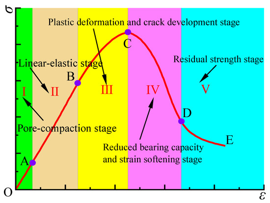 During the advancing process of the No.6107 working face, if the bottom coal pillar fails and destabilizes under the effect of a large front abutment pressure, it will lead to the loss of its bearing capacity and induce destabilization of the adjacent coal pillars, which will seriously threaten the safe mining of the overlying working face. Therefore, there is a lack of quantitative indexes on how to accurately judge and capture the timing of destabilization or loss of bearing capacity of coal pillars under mining disturbance, which makes it difficult to assess the stability of coal pillars and accurately prevent and control secondary disasters induced by coal pillar destabilization. In the existing studies, whether the coal pillar is destabilized or not is determined by analyzing whether the plastic zone inside the coal pillar is connected or whether the proportion of elastic core reaches a certain index; however, according to the full stress–strain curve of coal rock samples in the rock mechanics (Figure 7), the deformation of the rock is divided into five phases, i.e., respectively, the OA section: pore compression stage, the AB section: linear elastic stage, the BC section: plastic deformation and crack development stage, the CD section: reduced bearing capacity and strain softening stage, and the DE section: residual strength stage [39,44]. Point B is the turning point of coal and rock mass from elastic to plastic, i.e., the yield point; therefore, in the BC section, the rock mass is already in the stage of plastic deformation. At this time, the rock mass has not undergone destructive failure, and there is still a strong bearing capacity until it reaches the peak strength of the rock mass (point C), and its load-bearing capacity gradually deteriorates until the internal cracks converge to form a macroscopic fracture surface, which leads to the destructive failure of the rock mass. Therefore, it is insufficient to judge whether the coal pillar failure occurs only by the index of the plasticity zone.