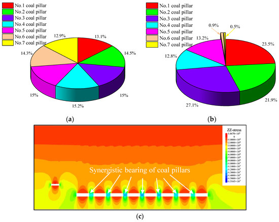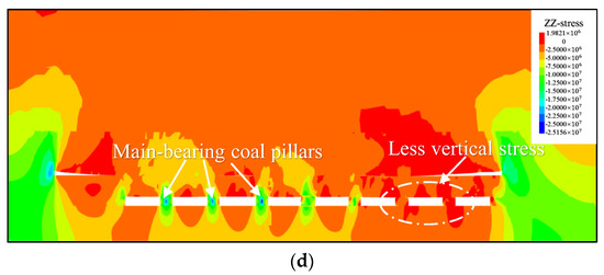 Figure 9 also shows that when the working face advanced to the vicinity of the No. 5 coal pillar, the vertical stresses of the adjacent coal pillars 4 and 5 also continued to decrease and were lower than their initial vertical stresses, respectively, due to the failure and destabilization of pillars 6 and 7. This led to a loss of their load-bearing capacity and a decrease in their vertical stresses, but the vertical stresses of the two pillars remained stable after the advancement of the entire working face. In addition, the vertical stresses of coal pillars No. 1, 2, and 3 increased as the working face continued to advance, indicating that during the advancement of the No. 6107 working face, the destabilization of pillars No. 6 and 7 resulted in the transference of loads of the interlayer strata and overburden of pillars No. 4 and 5, although pillars No. 4 and 5 did not destabilize under the effect of the front abutment pressure. This induced the cascading failure of pillars No. 4 and 5, but they were not completely destabilized and did not lose their load-bearing capacity; the effect did not extend further to cause a destabilization chain in pillars No. 1–3. At this point, the No. 9 seam room-and-pillar mining goaf was transformed from one in which the bearing of the coal pillars at the early stage of mining was coordinated (Figure 10a,c) to one in which the main bearing of pillars No. 1–3 and the synergistic bearing states of Ns. 4–5 operated when the No. 6107 working face was pushed out of the room-and-pillar mining goaf below, as shown in Figure 10b,d.