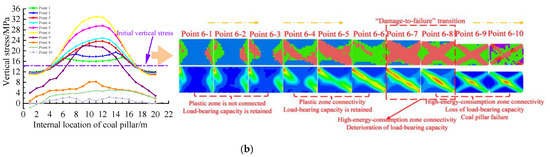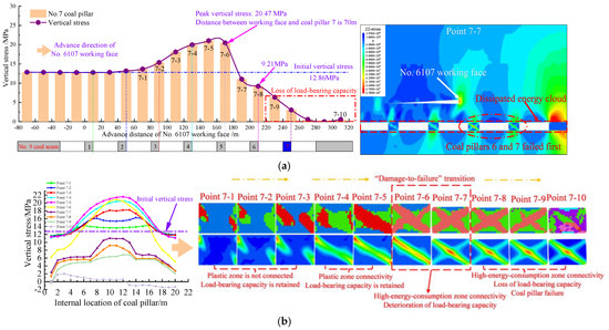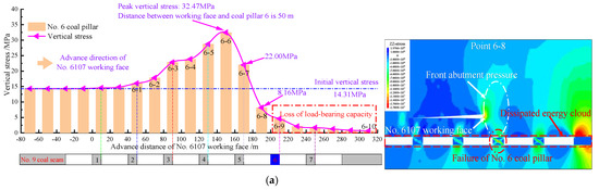 Figure 11 and Figure 12 show that during the disturbance of mining stress in the No. 6107 working face, the vertical stresses in the middle of coal pillars No. 6 and 7 gradually increased compared to the initial rock stress (Figure 11a and Figure 12a). At this point, the main area where the dissipative energy was concentrated in the corresponding coal pillars occurred in the upper left and lower right corners of the pillars. This shows that coal pillar plastic deformation and damage were occurring in these areas, and the main area in which the dissipative energy was concentrated continued to expand from the upper left and lower right corners to the center of the coal pillars until it gradually connected the outer edges of the dissipative area with the advancing of the working face. This shows that large plasticity and rupture occurred along the coal pillar in this direction, but the areas in which the main rupture released energy were not yet connected. When the working face advanced to positions 6-4 and 7-4, respectively, the plastic zones inside the coal pillars were connected (Figure 11b and Figure 12b), but the area in which the dissipative energy was concentrated inside the coal pillars was not connected, and the vertical stress inside the pillars continued to increase with the continued advancement of the working face; this indicates that the coal pillars retained a good load-bearing capacity (Figure 11b and Figure 12b). When the working face advanced to 6-6 and 7-6, respectively, the vertical stresses in the middle of pillars No. 6 and 7 reached a maximum of 32.47 MPa and 20.47 Mpa, respectively. At this time, the working face was 50 m and 70 m away from the corresponding coal pillars, respectively, the outer edges of the dissipative energy core were further connected, and the dissipative energy cores in the upper left and lower right angles were in a state of critical connectivity, which indicates that the main rupture release energy zone along that direction was in a state of critical connectivity. As the face advanced to 6-8 and 7-7, respectively, the vertical stress in the middle of the coal pillars was lower than the initial vertical stress. In addition, the dissipative energy core in the upper left and lower right corners of the coal pillar was completely connected, which indicates that the two coal pillars had formed a completely connected main rupture from the upper left to the lower right (the macroscopic fracture surface of coal pillar sliding damage), and the two pillars were undergoing damage and failure. At this time, the corresponding pillars No. 6 and 7 showed the largest rib deformation of 122 cm and 96 cm, respectively, and as shown in Figure 16, deformation of the coal pillar was seriously destabilized.
