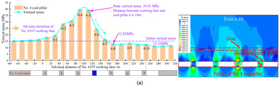 Figure 9 shows that when the No. 6107 working face advanced to the position in front of coal pillars No. 1 to 5, the vertical stresses of the corresponding coal pillars all increased substantially under the effect of the front abutment pressure. These increased from initial vertical stresses of 13.07, 14.43, 15.00, 15.16, and 14.95 MPa to 21.36, 29.60, 35.54, 39.01, and 41.24 MPa, respectively. This indicates that coal pillars No. 1–5 did not fail or destabilize during the process from the cutting eye to pushing out the No. 5 coal pillar in the No. 6107 working face. In addition, with the advancement of the working face, the coal pillar located on the later side suffered from a larger front abutment pressure, and it was more likely to fail and destabilize. Simultaneously, when the working face pushed through the above-mentioned coal pillars, the vertical stresses in their middle interfaces decreased and were lower than their initial vertical stresses. However, as the working face continued to push forward, the vertical stresses in the middle parts of pillars No. 1, 2, and 3 increased and were greater than the initial vertical stresses, whereas the vertical stresses in the middle parts of pillars No. 4 and 5 did not increase. This shows that coal pillars No. 1, 2, and 3 retained a certain bearing capacity and they had not failed in relation to the mining of the No. 6107 working face. However, when the working face was pushed to the front of the No. 5 coal pillar and then through the No. 5 coal pillar, the vertical stresses in the middle of pillars No. 6 and 7 reached their peaks and then decreased as the working face continued to push forward. The vertical stress did not rise in the internal part of the two pillars when the working face was pushed to the position in front of pillars No. 6 and 7, respectively, and it then decreased close to 0MPa, which indicates that these two pillars failed under the front abutment pressure of the No. 6107 working face and had lost their overall bearing capacity.