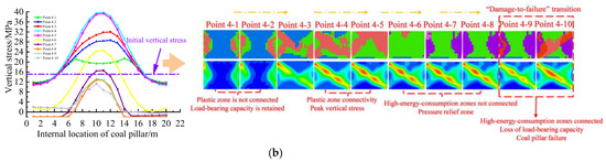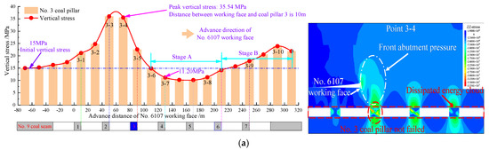 From Figure 15a,b, it is evident that during the process of the advancing No. 6107 working face, the plastic zone of pillar No. 3 under the effect of the front abutment pressure appeared to be connected, and its middle vertical stress distribution was transformed from a saddle shape to a single peak shape. However, during the entire mining process, the dissipative energy core in the coal pillar was not connected, and overall destabilization did not occur. The decrease in vertical stress corresponding to the No. 3 coal pillar (stage A) occurred after the face pushed through the coal pillar, and the main area of concentrated dissipative energy inside the corresponding coal pillar was not connected at this time, indicating that the vertical stress decrease in stage A was due to the pressure relief associated with working face mining. Later, in stage B, the increase in vertical stress was due to the gradual subsidence of the roof strata; as the working face continued to advance, the load continued to be transmitted downward, and subsequent redistribution of the load from the failure of other coal pillars occurred.