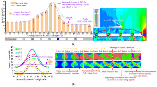 Characteristics of the correlation between vertical stress and energy dissipation in No. 5 coal pillar. (a) Vertical stress evolution law of No. 5 coal pillar. (b) Synergistic evolution law of vertical stress distribution and dissipated energy in the middle of No. 5 coal pillar.