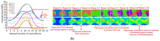 Characteristics of the correlation between vertical stress and energy dissipation in No. 6 coal pillar. (a) Vertical stress evolution law of No. 6 coal pillar. (b) Synergistic evolution law of vertical stress distribution and dissipated energy in the middle of No. 6 coal pillar.