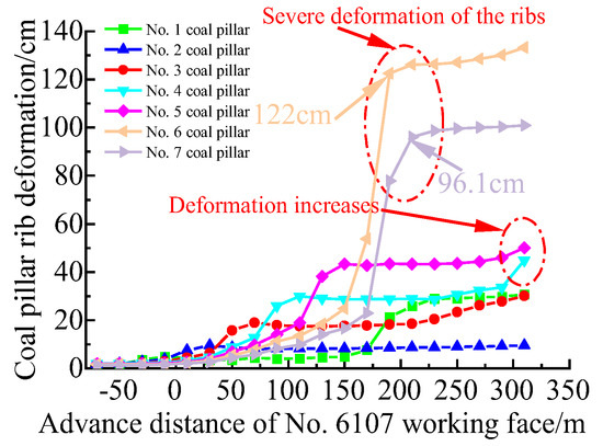 Deformation pattern of bottom coal pillar ribs during mining of No.6107 working face.
