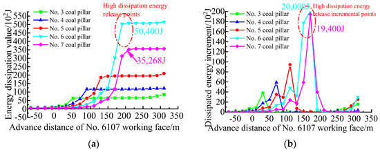 Working face mining process of No. 6107: (a) evolution of cumulative dissipated energy of coal pillars; (b) incremental evolution of dissipated energy of coal pillars.