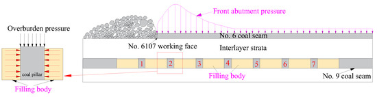 The results showed that the front abutment pressure formed by mining the No. 6107 working face will result in the failure and destruction of bottom coal pillars. This will further result in a loss of bearing capacity, which will seriously threaten the safe mining of the overlying working face. Therefore, we proposed an engineering method that involves grouting and filling the room-and-pillar mining goaf of the No. 9 coal seam to prevent the failure of the bottom coal pillars. As shown in Figure 18, the filling body was formed after solidification of the slurry filling in the room-and-pillar mining goaf; it had a lateral clamping effect on the bottom coal pillar that effectively restrained the expansion of cracks inside the coal pillars and increased the load-bearing capacity of the coal pillars. However, the lateral clamping force on the coal pillars from filling bodies with different strengths varies and affects the stability of the pillars; therefore, determining a reasonable filling strength is crucial for suppressing coal pillar failure and for guiding the proportions of the filling materials required.