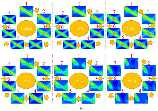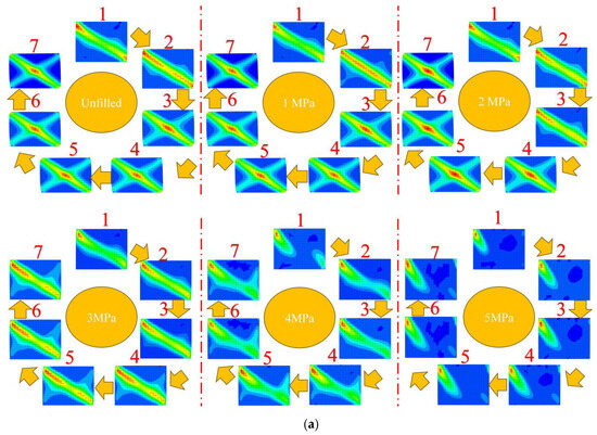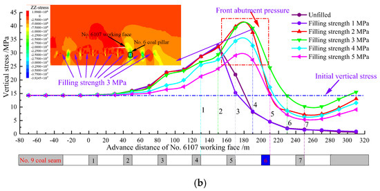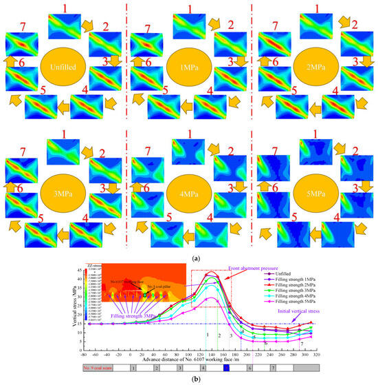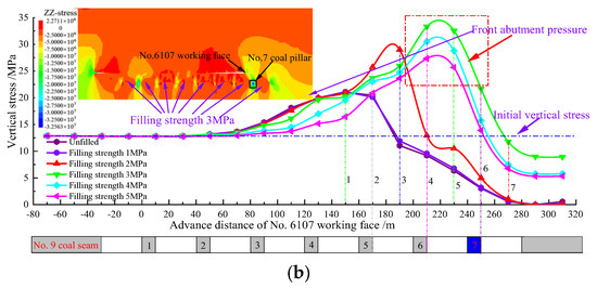As shown in Figure 19 and Figure 20, when the strength of the filling body was 1 MPa and unfilled, the upper left and lower right corners of pillars 6 and 7 were gradually connected to the dissipative energy core developed in the center of the coal pillar under the effect of the front abutment pressure in the No. 6107 working face (Figure 19a and Figure 20a). Both pillars formed a monoclinal penetration-type failure section, leading to the overall collapse and destabilization, and their middle vertical stress distributions and evolutionary patterns were similar throughout the entire mining process (Figure 19b and Figure 20b). This indicates that the lateral clamping forces formed by the filling body with a strength of 1 MPa were insufficient to prevent the failure of the coal pillars. When the strength of the filling body was 2 MPa, the bearing capacity of pillars 6 and 7 was increased under the clamping action of the filling body, and front abutment pressure was formed in the middle of pillar No. 6 when the working face advanced to its front. However, the front abutment pressure decreased and was lower than the initial vertical stress when it pushed through the coal pillar, as shown in Figure 19b. Furthermore, the main area in which dissipative energy was concentrated in pillar No. 6 was connected under the high front abutment pressure, and the coal pillar underwent destructive failure, as shown in Figure 19a. While the advancing position of the upper working face at the time of peak stress formation within the No. 7 coal pillar corresponded to a 20m advance compared to the unfilled position, a reduction in vertical stress still occurred at the position in front of No. 7 coal pillar, and the main areas in which dissipative energy was concentrated inside the coal pillar were connected.