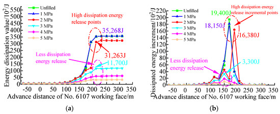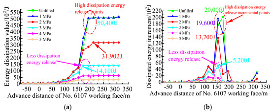 Clamping effect of using filling bodies with different strengths in coal pillar No. 7: (a) evolution of cumulative dissipated energy; (b) evolution of incremental dissipated energy.
