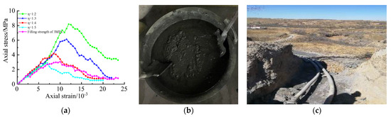 Therefore, it is necessary to analyze the most reasonable proportion of fly ash and cement required to satisfy the filling requirements and to also consider the influence of the time effect of the consolidation action of the grouted filling body on its strength. During field operations, mining in the No. 6107 working face began 28 days after the completion of grouting and filling in the No. 9 seam room-and-pillar mining goaf. This led to inaccurate assessments of the strength of the filling body at the engineering scale, as the consolidation time of filling body specimens with shorter proportions did not reflect their true strength [45]. Different fly ash to cement proportions (mass ratios (η) of 2:1, 3:1, 4:1, and 5:1) at 28 days were selected to determine the optimum laboratory physio-mechanical parameters. The results were then compared (Figure 25a) with those of the filling physio-mechanical parameters obtained via the numerical simulation when a strength of 3 MPa was used, and fly ash to cement mass ratios of 2:1, 3:1, and 4:1 were found to meet the filling strength requirements. To avoid water resolution, the amount of cement incorporated should not be too high; therefore, a filling slurry with a fly ash to cement mass ratio of 4:1 was selected, as shown in Figure 25b. In addition, fly ash with a low calcium oxide content was selected to reduce the degree of hydration reaction and the cementitious compound formation rate. A certain amount of lignosulfonate retardant was also employed to prevent the cement from curing and solidifying. Notably, the grouting process took full advantage of the terrain and adopted unpressurized self-flow conveyance. The filling pipeline is shown in Figure 25c.
