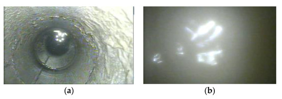 As an unavoidable dry shrinkage effect occurs during the filling slurry consolidation process and the filling body between the bottom coal pillars of the horizontal surplus space increases to a certain extent, there is a slight reduction in the lateral clamping force of the filling body in the bottom coal pillars. The effective filling height of the room-and-pillar mining goaf below the No. 6107 working face also has an important influence on the stability of the coal pillars. Therefore, the room-and-pillar mining goaf of the No. 9 coal seam under the No. 6107 working face was filled up as far as possible, and in situ observations of the filling effect on the room-and-pillar mining goaf and the stability of the coal pillars under the effect of mining were conducted using borehole TV via unsealed grouted boreholes. Combined with the earlier results, these results showed that the No. 6 coal pillar in the middle of the No. 9 coal seam was the first to exhibit destructive failure; therefore, the TV observation hole was located in the middle of the No. 9 coal seam room-and-pillar mining goaf. The drilling TV monitor was first lowered to a depth of 160.505 m to observe this mining area (Figure 26a), and it was then lowered to −162.595 m to observe the water surface of the filling area, as shown in Figure 26b. The No. 9 coal seam room-and-pillar mining goaf in this range has an unconnected roof height of approximately 2 m, and the height of the filling body basically reaches more than 6 m. A good filling effect was achieved, and this means that the No. 6107 working face could be safely pushed through at a later stage.