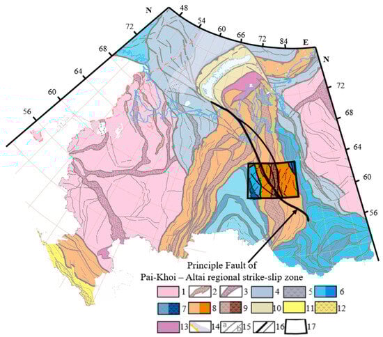 Figure 1. Location map showing the Pai-Khoi-Altai regional strike-slip zone in the West Siberia basin. Symbols: 1–3—ancient platforms; 4–5—Baikalian folded areas and interblock suture zones; 6–7—Caledonian folded; 8–9—Hercynian folded area; 10—Cimmerian folded areas; 11–12—Alpine folded areas; 13—oceanic areas; 14—continental slopes and deep-sea depressions; 15—faults; 16—faults of the Pai-Khoi-Altai strike-slip zone; 17—research site.