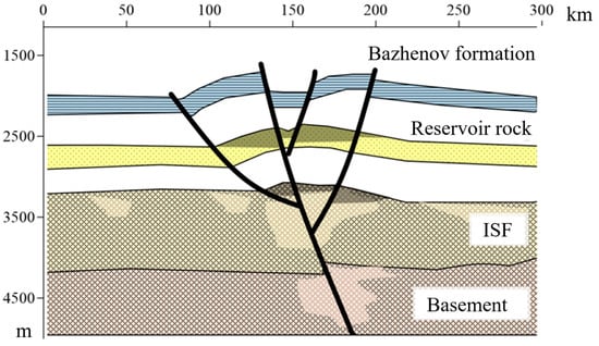 The formation of “flower structures” may disrupt the integrity of the reservoir with the creation of tectonically screened traps. Deposits in zones with the development of such structures will have a complex blocky or lens-like character, likely without a single water-oil contact. Furthermore, the actual development of tectonic faults results in the formation of additional porous space in reservoirs of various types [,], including in the weathering crust of the basement and weakly metamorphosed sediments in areas adjacent to fault disruptions and fluid alteration zones.