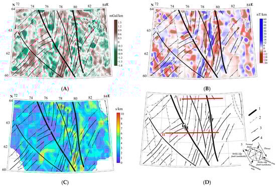 Figure 5. Maps of the vertical derivative of the gravitational field in Bouguer reduction (A), the vertical derivative of the anomalous magnetic field (B), the horizontal gradient of the isochron reflecting the “B” horizon (C), and the results of tectonic decoding (D). 1—major faults; 2—fold boundaries; 3—boundaries of horst-graben structures; 4—other fault disruptions; 5—strain ellipsoid. Red lines indicate the positions of seismic sections presented in Figure 6.