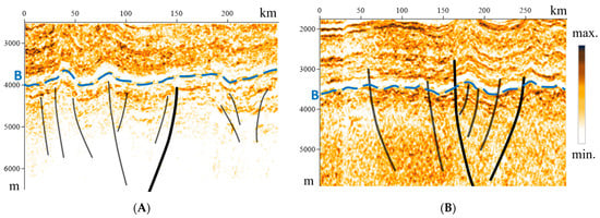 Strike-slip structures are revealed in sections of the West Siberia sedimentary basin at different scales. For example, in 3D seismic survey data, strike-slips extending tens of kilometers form systems of disruptions within the Mesozoic layers []. When interpreting data from regional 2D seismic survey profiles at deeper levels of the section, the “flower structure” is less clearly observed due to the chaotic distribution of the wave field []. Figure 6 schematically illustrates the manifestation of the principal and adjacent feathering dislocations of the strike-slip zone.