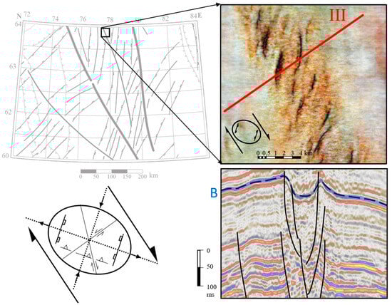 One of the clear confirmations of the position and structure of the regional strike-slip structure is in 3D seismic data, presented fragmentarily within small areas at the polygon. Data at one of the oil fields, studied by 3D seismic exploration at the level of the reflecting horizon B, indicate that the dominant strike-slip zone of the north–northwest direction. As practice shows [,], one of the best ways to demonstrate 3D seismic data is spectral decomposition, so this approach was used for the visualization of the Bazhenov formation surface in Petrel software. Taking into account orientation of en-echelon folds and faults, we can assume right-lateral kinematics. The section along line III confirms the presence and intensity of the flower structure (Figure 7).