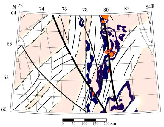 In the current work, using one specific area as an example, we examine the relationship between the formation of deep oil and gas deposits and the positions of principal strike-slip and splaying faults. We started with the assumption that strike-slip zones largely control the formation of fluid-permeable zones within the areas of main and splaying faults. The study area chosen for research is located in the central part of the West Siberia petroleum and gas province and includes map sheets P-43 and P-44, which are intersected by the regional Pai-Khoi-Altai strike-slip zone from southeast to northwest (see Figure 1) [].