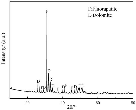 The experimental ore sample is a medium–low-grade calcium–magnesium phosphate ore taken from a phosphate mine in Guizhou, China. As can be seen from Figure 1, the valuable mineral in the original ore is fluorapatite (Ca5F(PO4)3), while dolomite (CaMg(CO3)2) is the associated vein mineral.