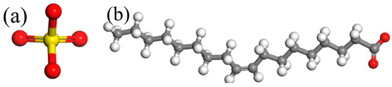 The crystal models of both the minerals were sourced from the AMCSD database. The original lattice parameters for fluorapatite were a = b = 9.397 Å and c = 6.878 Å, while the original lattice parameters for dolomite were a = b = 4.815 Å and c = 16.119 Å. After optimization, the lattice parameters for fluorapatite became a = b = 9.444 Å and c = 6.887 Å, and, for dolomite, they were a = b = 4.823 Å and c = 16.046 Å. These optimized lattice parameters closely matched the original lattice parameters. To prepare the system, the fluorapatite and dolomite mineral crystals were cleaved along their most common cleavage planes, expanding the supercell. The Amorphous Cell module was used to construct the solution model of the pharmaceutical solution. In addition, the Build Layers tool was used to construct the pharmaceutical solution model and incorporated fluorapatite or dolomite to form the fluorapatite–/dolomite–pharmaceutical solution system. The number of water molecules in the solution model was 2000; the number of H2SO4 molecules was 100; and the number of NaOl molecules was 20. The optimized configurations for sulfate and oleic acid ions are shown in Figure 2.