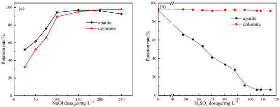 Effect of agent dosage on the floatation ratio of apatite and dolomite. (a) NaOl dosage. (b) H2SO4 dosage; the dosage of NaOl was 150 mg/L.