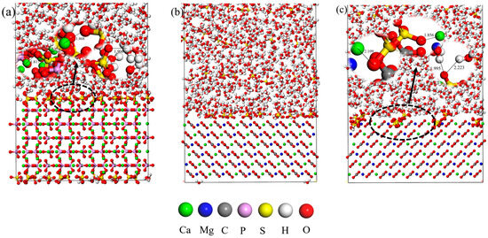 Molecular dynamics calculation of equilibrium configuration of mineral–H2SO4 solution system. (a) Fluorapatite; (b) perfect dolomite; (c) defective dolomite.