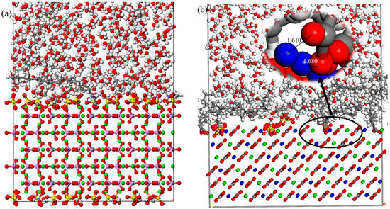 Figure 7 shows the configuration of the fluorapatite–/dolomite–H2SO4 and NaOl solution system after the molecular dynamics calculations were completed. According to the kinetic calculation equilibrium configuration and bond population analysis, it can be seen that the Ca site on the surface of fluorapatite was not bonded with the oleate ions. The main components on the surface of fluorapatite were SO42− and H2O. A large number of oleate ions were adsorbed on the surface of the dolomite, and the Mg-O bonds were formed by the interaction of oleate ions with Mg atoms on the surface of the dolomite. Some of the Mg-O bonds were 1.610 and 1.680 Å in length, and as shown in the black circle in Figure 7b. The surface of dolomite was mainly composed of SO42− and oleate ions.