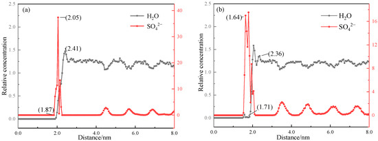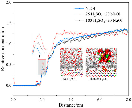 Figure 11 shows the relative concentration distribution curves of water molecules on the dolomite surface along the z-axis direction for different amounts of H2SO4. The relative concentration of water molecules on the dolomite surface was larger when the sulfate was less, and the relative concentration of water molecules on the surface decreased on continuing to increase the amount of H2SO4. Combining the equilibrium adsorption configuration analysis, when the solution is free of H2SO4, all the exposed Ca/Mg sites on the dolomite surface will interact with oleate ions, forming a tight adsorption layer on the surface. In the presence of H2SO4 in the solution, the SO42− interacts with the Ca sites on the surface of dolomite. After the sulfate ions are adsorbed on the surface of dolomite, the active sites on the surface of dolomite decrease, and the adsorption layer formed by the action of oleate ions becomes looser. Some water molecules can break through the adsorption layer of oleate ions and adsorb on the surface of dolomite. Water molecules will interact with SO42− to adsorb onto the surface of the dolomite and water molecules will also interact with SO42− adsorbed onto the surface to form hydrogen bonds if the amount of H2SO4 in the solution is low. When there is more H2SO4 in the solution, the defect space on the dolomite surface is completely occupied, SO42− is adsorbed on the dolomite surface, and the SO42− adsorbed on the dolomite surface hinders the interaction between water molecules and Ca sites on the dolomite surface; the water molecules can only interact with surface-adsorbed SO42− radicals. This may be the reason why the contact angle of dolomite increased with increasing H2SO4 content and decreased again with increasing H2SO4 content.