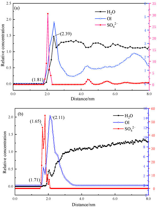 Relative concentrations of SO42−, oleate ions, and water molecules along the z-axis at the mineral surface in fluorapatite–/dolomite–sulfuric acid, NaOl solutions. (a) Fluorapatite; (b) dolomite.