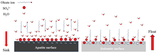 The relative concentrations of water molecules on the surface of the fluorapatite peak are shown in Figure 9. The fact that the water molecules were denser on the surface of fluorapatite is evident from the adsorption configuration of both systems. The results showed that the surface of fluorapatite was still hydrated after interaction with H2SO4 and NaOl. The relative concentration distribution curve of water molecules on the surface of dolomite had no peak value, and there was no hydration on the surface of dolomite after the adsorption of oleate ions. The relative concentration distribution curves explain the decrease in the floatation ratio and contact angle of apatite after the addition of H2SO4 in the single-mineral flotation and the contact angle measurement. The simulation results were in agreement with the results of single-mineral flotation and contact angle measurement. In the reverse flotation of phosphate rock, the interaction between oleate ions and the surface of apatite was hindered by H2SO4 to keep it hydrophilic, and the apatite particles in the pulp were hydrophilic and sank. The interaction between oleate ions and Mg sites on the surface of dolomite was not affected by H2SO4. A large amount of oleate ion was adsorbed on the surface of dolomite, which made the surface of dolomite have good hydrophobicity. The dolomite particles adhered to bubbles and floated up; the flotation models of apatite and dolomite are presented in Figure 10.