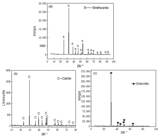 XRD patterns of (a) smithsonite, (b) calcite, and (c) dolomite.