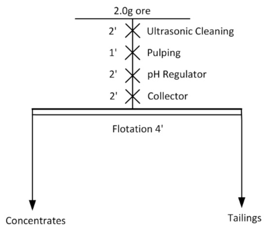 The flotation test was carried out in an XFG-type flotation machine with a 40 mL plexiglass cell. The mineral samples were firstly cleaned with an ultrasonic cleaner (KQ2200DE, Kunshan Ultrasonic Instrument Co., Ltd., Kunshan, China) for 2 min. All minerals were flotated separately in the experiments. The mineral pulp was prepared by adding 2.0 g of the mineral sample and 25 mL of deionized water to the cell. HCl and NaOH can quickly adjust pH levels in very small amounts. In addition, the ions generated by these two regulators have little impact on the flotation system. So the pH was adjusted with HCl or NaOH, and stirred for 2 min. And the collector was added sequentially with a mixing time of 2 min. After that, the flotation was performed for 4 min. It should be noted that pine oil was used in very small amounts as a frother for flotation carried out in acidic conditions after adding the collector. The float and sink fractions were dried and weighed, respectively, and the recovery was calculated. The rotating speed of the flotation machine was 1900 r/min. The single-mineral flotation test process is shown in Figure 2.