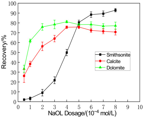 The test results show that the recoveries of the three minerals increase rapidly with the increasing concentration of sodium oleate when the concentration range is below 4 × 10−4 mol/L. When the concentration of sodium oleate is greater than 6 × 10−4 mol/L, the recoveries of the three minerals tend to be flat. On the other hand, the recoveries of both calcite and dolomite are larger than that of smithsonite when the concentration of sodium oleate is less than 5 × 10−4 mol/L, indicating that the floatability of these two carbonate gangue minerals is better than that of smithsonite under natural pH conditions, unless the dosage is increased to a large extent. But the recovery difference between smithsonite and the gangue minerals is still not large. Therefore, smithsonite, calcite, and dolomite cannot be effectively separated under natural pH conditions.