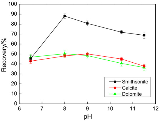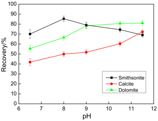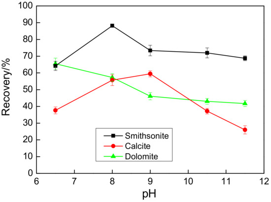 When the concentration of sodium oleate is greater than 6 × 10−4 mol/L, the recovery difference among the three minerals exhibited small variation, as shown in Figure 3. Therefore, from the perspective of collector dosage control, the collector concentration of 6 × 10−4 mol/L was selected for pH study. To further effectively separate smithsonite and carbonate gangue with a sodium oleate concentration of 6 × 10−4 mol/L, flotation tests were carried out on smithsonite, calcite, and dolomite under different pH conditions, and the test results are shown in Figure 4.
