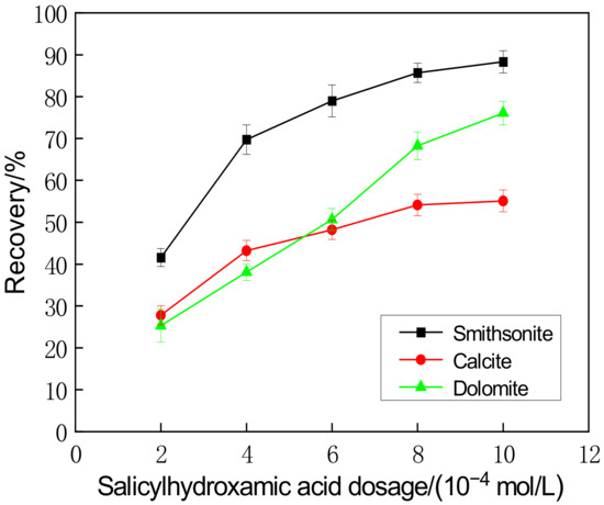 The recovery difference value of smithsonite with calcite and dolomite can reach 26.62% and 30.71%, respectively, when the concentration of salicylhydroxamic acid is 4 × 10−4 mol/L, but the recovery of smithsonite is as low as 69.29%. When the concentration of salicylhydroxamic acid is 6 × 10−4 mol/L, the recovery difference value of smithsonite with calcite and dolomite reaches 31.37% and 29.49%, and the recovery of smithsonite can reach a higher 79.78% at this time.